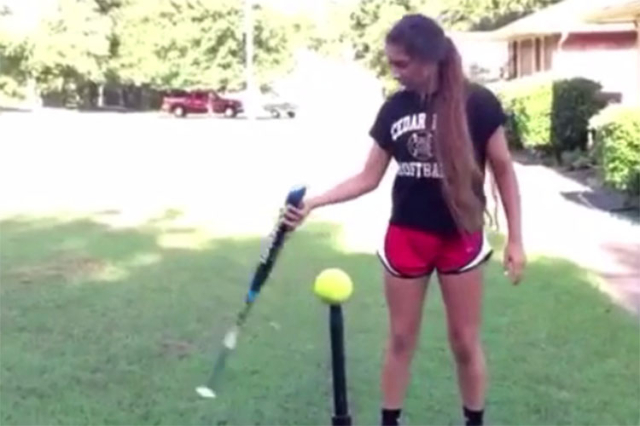 Marisa Arriaga, who hails from Cedar Hill, Texas, posted a video in which she lifts a bat off the ground with her foot, bounces it behind her back, kicks a softball off a tee, juggles it and then crushes it into the woods.