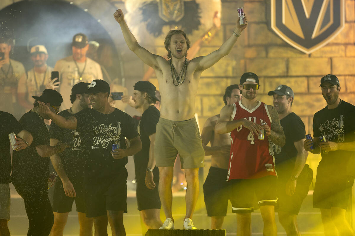 Lots of shirts came off. At one point, center Jack Eichel also did some lifting, throwing Conn Smythe Trophy winner Jonathan Marchessault over his shoulder. Adin Hill received a huge ovation, for his stellar play in goal during the playoffs and also because he wore a Larry Johnson UNLV basketball jersey.
