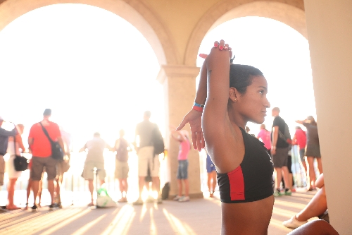 I arrived at Henderson Pavilion just as the Extreme People, who were wearing aerodynamic helmets that made them look like FTD florists, were putting down their bicycles and putting on their running shoes. The panting was minimal when the leaders came in, but those helicopter rotors were giving me a headache. Sanctuary was sought in the pavilion, where they were showing the half-marathon on the Ironman channel.