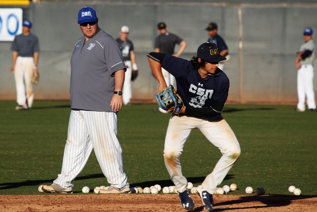 On the front of the desk in the clubhouse office of College of Southern Nevada baseball coach Nick Garritano is a miniature leather baseball glove he uses as a business card holder. A full complement of business cards was stacked neatly in the pocket on Tuesday afternoon.