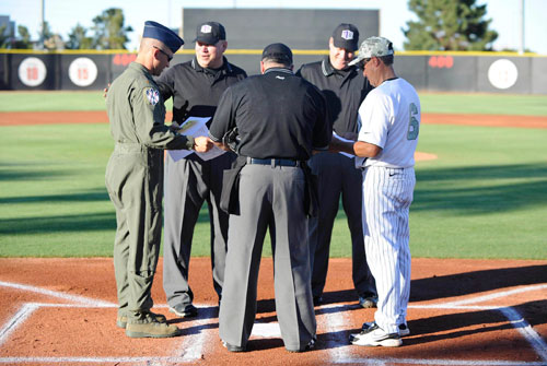 When the teams played here last month, the Rebels honored the Falcons by wearing camouflage jerseys and caps. Chambers asked Kazlausky to throw out the first pitch, and Kazlausky coached the entire game in his olive drab flight suit.