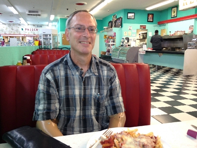 Scott Martin is 55, which is just a little older than the soda fountain furnishings at Huntridge Drugs — except for the soda machine itself, which is new. The soda jerk said the ice cream containers and the counter and the little stools with the red vinyl covers have been there since 1962. Almost as old as you guys, he said. Easy there, Jughead.