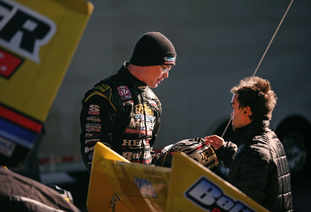 It was a chilly Wednesday night at Las Vegas Motor Speedway’s dirt track, around 8:30. The World of Outlaws heat races had just finished and Joey Saldana, aka the Brownsburg Bullet, was wearing a stocking cap and working on his yellow No. 71 sprint car with a crescent wrench. You don’t see that in NASCAR or on the IndyCar circuit anymore.