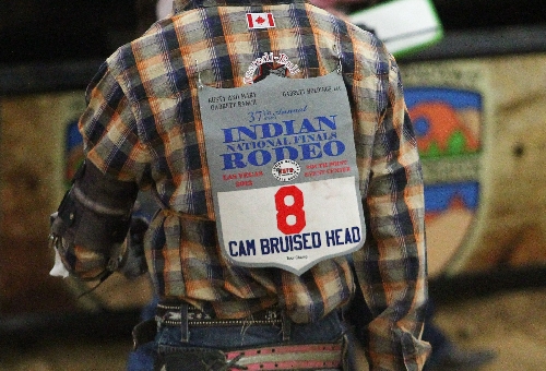 One of the INFR officials, a Peigan, told me Blackfoot sometimes are named for a seminal event that occurs at birth or shortly after. But Clint Bruised Head said the family surname has nothing to do with rodeo, or rodeo season, or falling off a ladder.