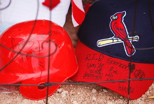 There was a white cross with a red "S" on its crosshairs, adorned with two plastic cardinals. There was a red miniature Cardinals batting helmet with Spencer Melvin's number 5 scrawled on the side in felt pen, and a message that said he forever would be in the hearts of the ones who had placed it there.