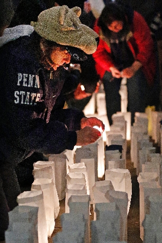 The Hall of Fame coach died of lung cancer Jan. 22, 2012, at age 85. Besides the bouquets and signs, at least 150 supporters also marked the anniversary of his death with a candlelight vigil on a frigid evening at a downtown State College mural that includes a depiction of Paterno.
