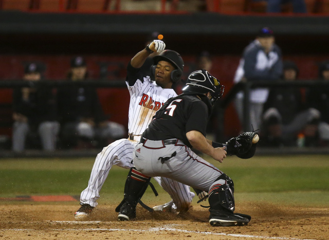 UNLV's outfielder Keyon Allen (1) beats Omaha catcher Nate Mallott (25) to home base to score during their opening season baseball game at Earl E. Wilson Stadium at UNLV in Las Vegas on Friday, Feb. 17, 2017. (Chase Stevens/Las Vegas Review-Journal) @csstevensphoto