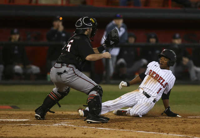 UNLV's outfielder Keyon Allen (1) scores a run as Omaha catcher Nate Mallott (25) misses the ball during their opening season baseball game at Earl E. Wilson Stadium at UNLV in Las Vegas on Friday, Feb. 17, 2017. (Chase Stevens/Las Vegas Review-Journal) @csstevensphoto