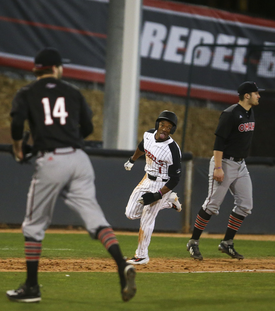 UNLV's outfielder Keyon Allen (1) heads for home base to score against Omaha during their opening season baseball game at Earl E. Wilson Stadium at UNLV in Las Vegas on Friday, Feb. 17, 2017. (Chase Stevens/Las Vegas Review-Journal) @csstevensphoto