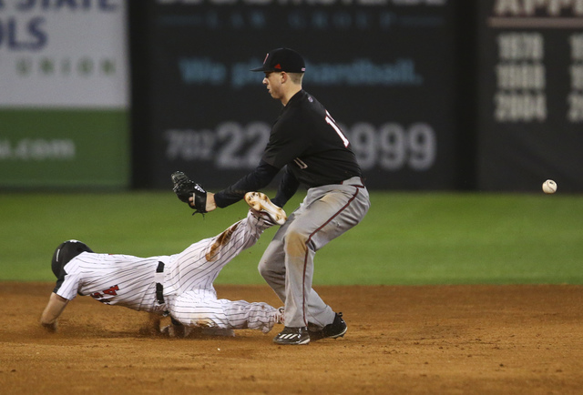 UNLV's outfielder Ernie De La Trinidad (25) slides safely into second base as Omaha infielders Sam Palensky (11) and Bryson Stott (10) miss the ball during their opening season baseball game at Earl E. Wilson Stadium at UNLV in Las Vegas on Friday, Feb. 17, 2017. (Chase Stevens/Las Vegas Review-Journal) @csstevensphoto