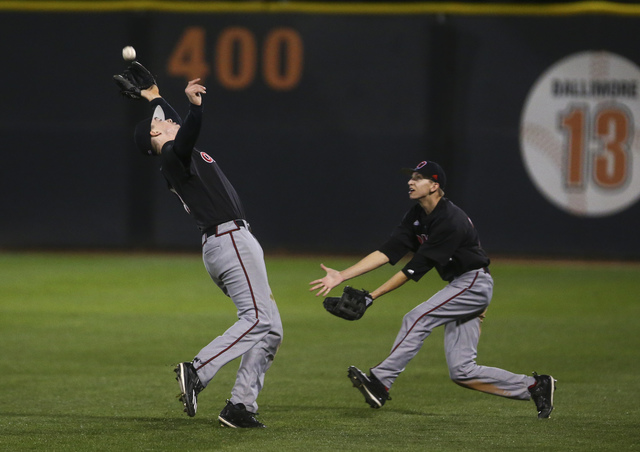 Omaha outfielders Riley Herold (10) and Cal Hehnke (2) misses the ball during their opening season baseball game at Earl E. Wilson Stadium at UNLV in Las Vegas on Friday, Feb. 17, 2017. (Chase Stevens/Las Vegas Review-Journal) @csstevensphoto