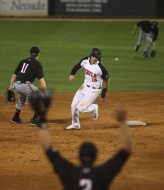 UNLV's Blaze Bohall (20) runs for third base during their opening season baseball game at Earl E. Wilson Stadium at UNLV in Las Vegas on Friday, Feb. 17, 2017. (Chase Stevens/Las Vegas Review-Journal) @csstevensphoto