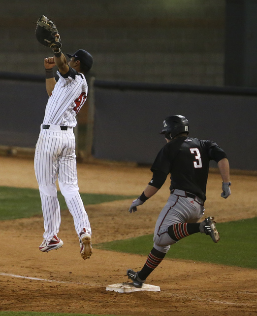 UNLV's Austin Anderson (4) catches the ball to get out Omaha's Cole Thibodeau (20) during their opening season baseball game at Earl E. Wilson Stadium at UNLV in Las Vegas on Friday, Feb. 17, 2017. (Chase Stevens/Las Vegas Review-Journal) @csstevensphoto