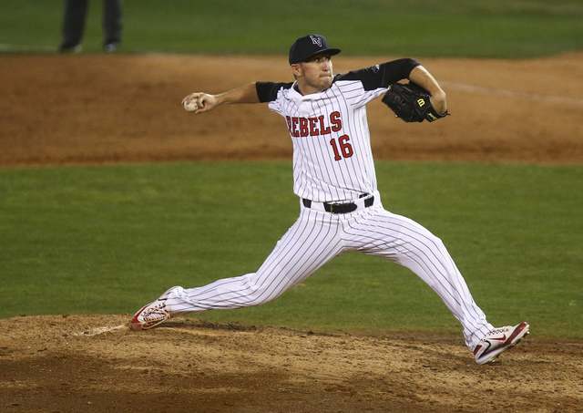 UNLV's Alan Strong (16) pitches to Omaha during their opening season baseball game at Earl E. Wilson Stadium at UNLV in Las Vegas on Friday, Feb. 17, 2017. (Chase Stevens/Las Vegas Review-Journal) @csstevensphoto