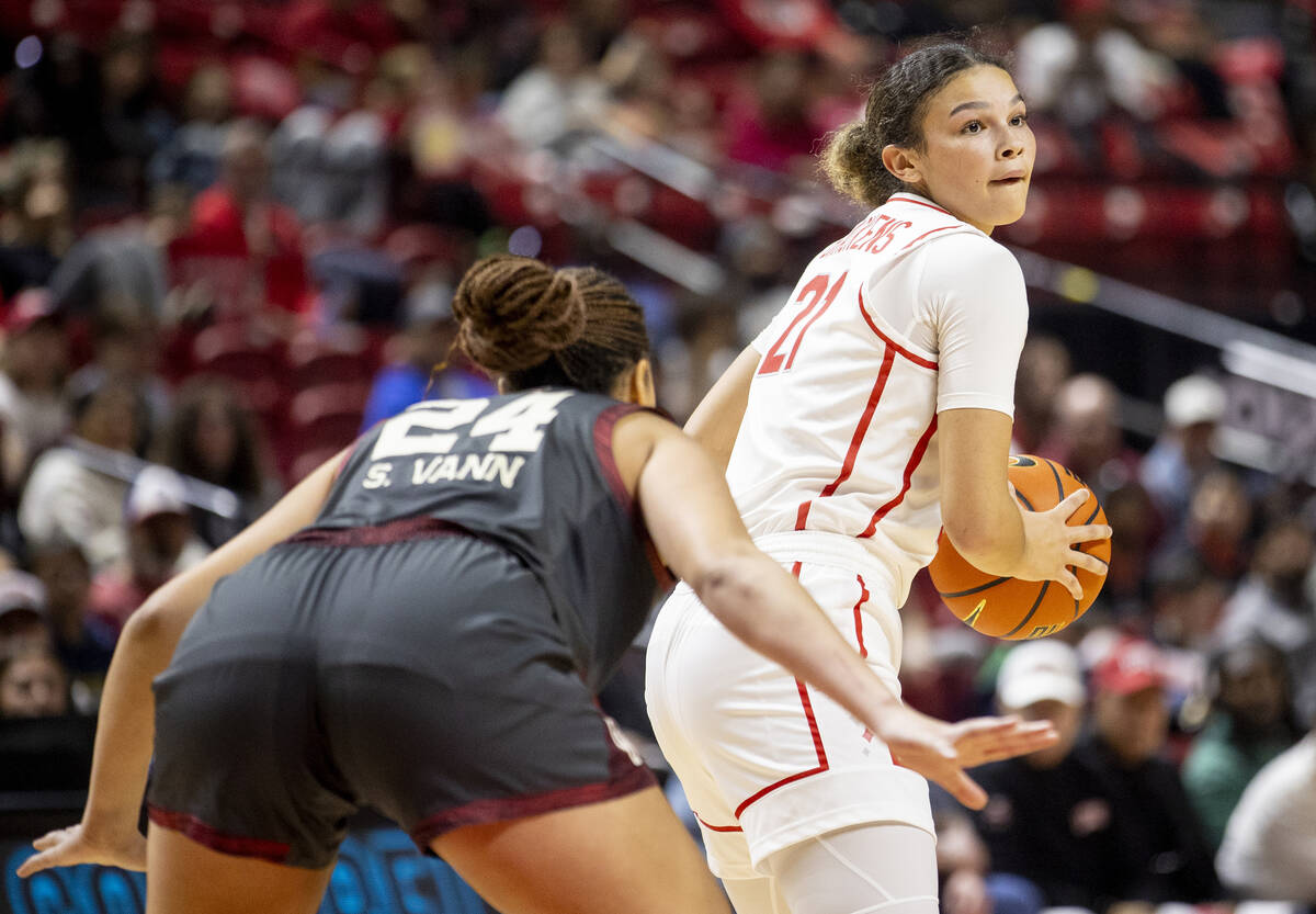 UNLV forward McKinna Brackens (21) looks to pass the ball during the college basketball game against the Oklahoma Sooners at the Thomas & Mack Center, Friday, Nov. 22, 2024, in Las Vegas. (Daniel Jacobi II/Las Vegas Review-Journal)