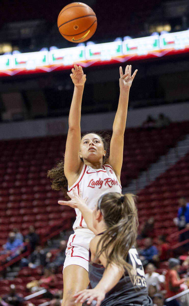 UNLV forward McKinna Brackens (21) watches her shot go to the basket during the college basketball game against the Oklahoma Sooners at the Thomas & Mack Center, Friday, Nov. 22, 2024, in Las Vegas. (Daniel Jacobi II/Las Vegas Review-Journal)