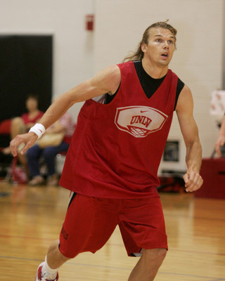 In Friday afternoon's practice, former Rebels Kevin Kruger, White, Louis Amundson, Romel Beck and Dustin Villepigue formed a team to practice against UNLV seniors Wink Adams, Joe Darger, Rene Rougeau and Mareceo Rutledge, sophomores Kendall Wallace and Tre'Von Willis and 7-foot freshman Beas Hamga.