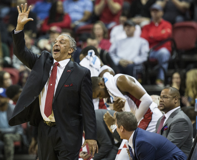 UNLV’s head coach Marvin Menzies calls an offensive play during the Rebels home matchup with the Broncos on Wednesday, Jan. 4, 2016, at the Thomas & Mack Center, in Las Vegas. Benjamin Hager/Las Vegas Review-Journal