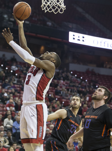 UNLV’s Tyrell Green (3) shoots over Boise State’s Nick Duncan (13) during the Rebels home matchup with the Broncos on Wednesday, Jan. 4, 2016, at the Thomas & Mack Center, in Las Vegas. Benjamin Hager/Las Vegas Review-Journal