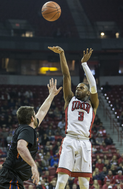 UNLV’s Jovan Mooring (30) shoots a three point shot during the Rebels home matchup with the Broncos on Wednesday, Jan. 4, 2016, at the Thomas & Mack Center, in Las Vegas. Benjamin Hager/Las Vegas Review-Journal
