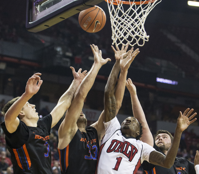 UNLV’s Kris Clyburn (1) fights for a rebound with Boise State’s David Wacker (33), Nick Duncan (13) and Justinian Jessup (3) during the Rebels home matchup with the Broncos on Wednesday, Jan. 4, 2016, at the Thomas & Mack Center, in Las Vegas. Benjamin Hager/Las Vegas Review-Journal