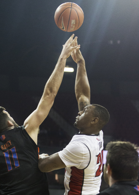 UNLV’s Jovan Mooring (30) fights for position with Boise State’s Zach Haney (11) during the Rebels home matchup with the Broncos on Wednesday, Jan. 4, 2016, at the Thomas & Mack Center, in Las Vegas. Benjamin Hager/Las Vegas Review-Journal