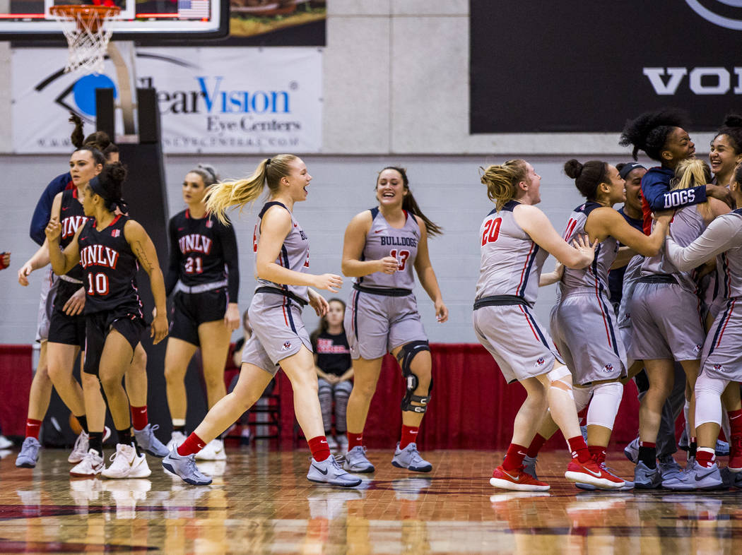 Fresno State players celebrate after a narrow victory against the UNLV Lady Rebels at Cox Arena in Las Vegas on Wednesday, Jan. 24, 2018. Fresno State won 74-72. Patrick Connolly Las Vegas Review-Journal @PConnPie