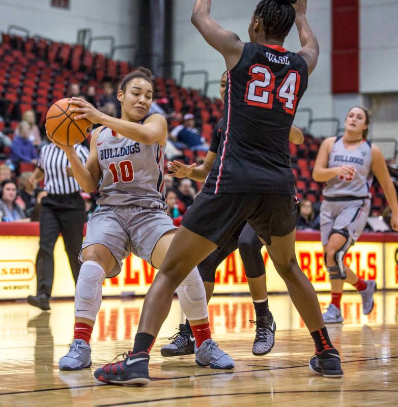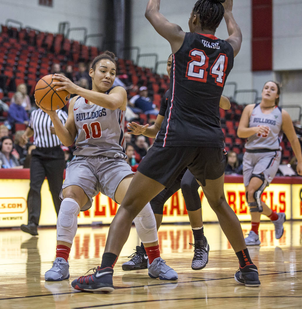 Fresno State’s Candice White (10) looks for a pass while UNLV’s Rodjanae Wade (24) tries to block her at Cox Arena in Las Vegas on Wednesday, Jan. 24, 2018. Fresno State won 74-72. Patrick Connolly Las Vegas Review-Journal @PConnPie