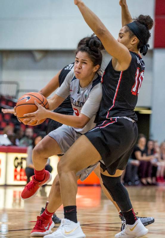 UNLV’s Nikki Wheatley (10) goes up for a shot while Fresno State’s Maddi Utti (11) and Aly Gamez (22) try to block her at Cox Arena in Las Vegas on Wednesday, Jan. 24, 2018. Fresno State won 74-72. Patrick Connolly Las Vegas Review-Journal @PConnPie