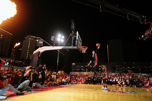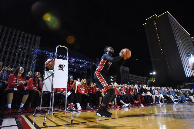 Less than two weeks after suffering a sprained left ankle, the UNLV freshman jumped over three teammates on his way to winning the dunk contest at the Runnin’ Rebel Madness event at the Downtown Las Vegas Events Center, which drew a crowd of around 3,000.