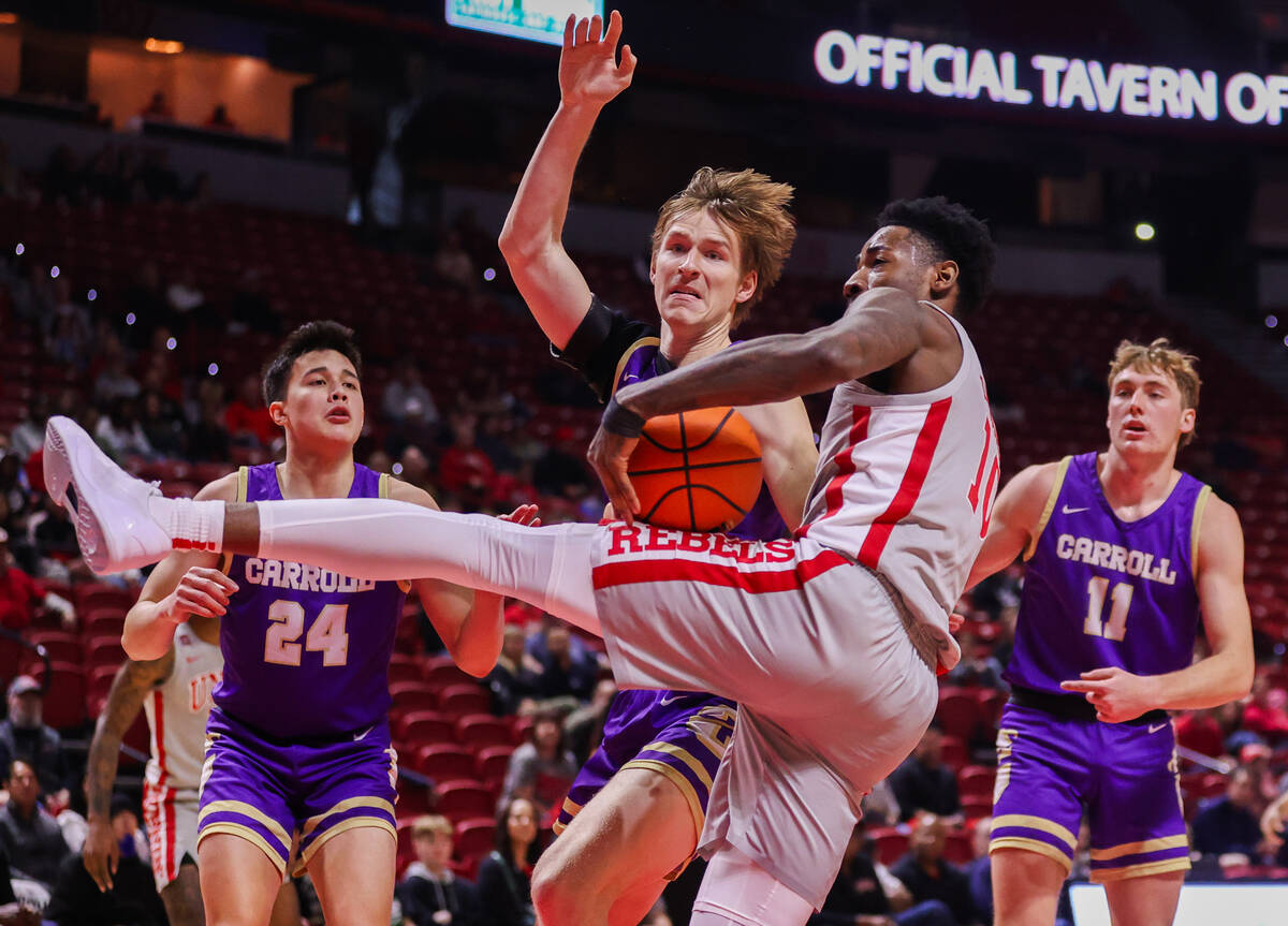 The Rebels began to take control once they started to take advantage of 17 Carroll first-half turnovers. Rodriguez forced a steal that led to a Boone dunk to end their scoring drought, and the Rebels went on a 15-0 run the next seven minutes.