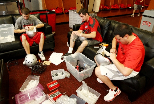 Across the hall in the locker room, several managers assemble the helmets -- attaching the chin straps, jaw straps and face masks -- that arrived last month.