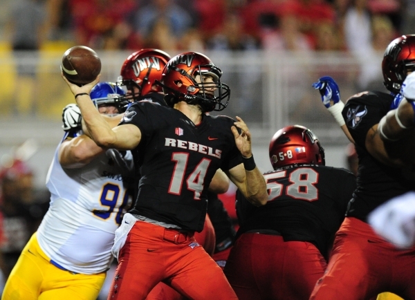 UNLV Rebels quarterback Kurt Palandech (14) passes against San Jose State in the second quarter at Sam Boyd Stadium in Henderson Saturday, Oct. 10, 2015. Josh Holmberg/Las Vegas Review-Journal