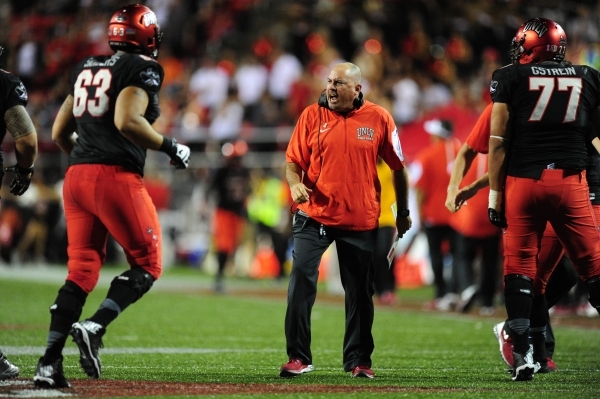 UNLV Rebels head coach Tony Sanchez watches on as his team kicks a point after attempt, after UNLV scored the go-ahead touchdown against San Jose State in the fourth quarter at Sam Boyd Stadium in Henderson Saturday, Oct. 10, 2015. San Jose State defeated UNLV 33-27 in overtime. Josh Holmberg/Las Vegas Review-Journal