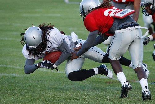 Senior wide receiver Phillip Payne, who has been out with an injured right foot, did some light running. He also was out of his walking boot. Hauck said he still didn’t know if Payne would be back by the Sept. 1 season opener at Wisconsin. Freshman cornerback Fred Wilson broke up a deep pass to freshman wide receiver Devante Davis, only to have Davis later come back and make a spectacular one-handed grab despite Wilson’s tight coverage downfield. Senior tight end Austin Harrington made a nice catch while falling backward. Junior safety Dre Crawford intercepted a pass.