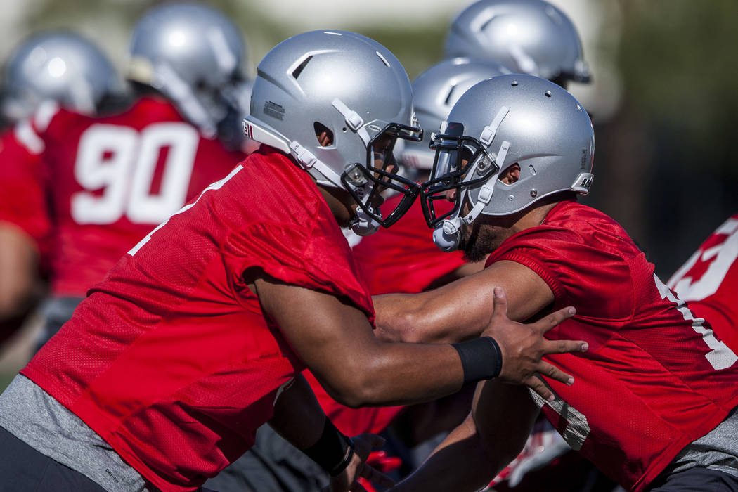 — J’Ondray Sanders, a senior from Basic High School, worked at No. 1 center. He’s competing with junior Zack Singer, who went to Bishop Gorman and ran with the starters the first two days. Sanchez said the two are splitting opportunities. The expected starter, junior Sid Acosta, has not returned from a knee injury suffered in spring practices and isn’t expected to play until after the season begins Sept. 2 against Howard at Sam Boyd Stadium.