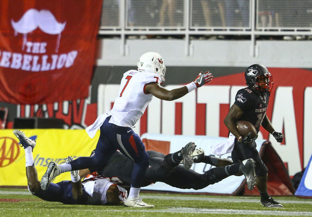 Cooper, who coached San Diego State running back Donnel Pumphrey, the nation’s leading rusher (750 yards), at Canyon Springs High School, holds the Rebels record for most rushing yards in a game by a quarterback with 165. Sneed came up 18 yards short of that record Saturday, when he finished with 147 rushing yards, 91 of them on the touchdown run that was the longest offensive play from scrimmage in school and Sam Boyd Stadium history.