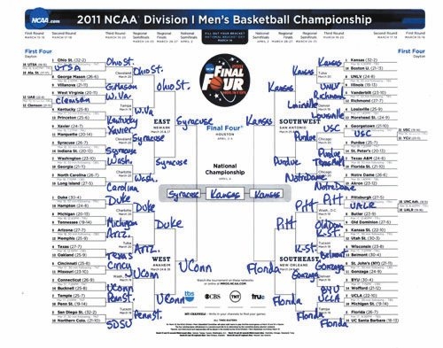 Two Big East teams, Syracuse and Connecticut, Kansas from the Big 12 and Florida out of the Southeastern Conference make up my Final Four, with Kansas the pick to win it all.