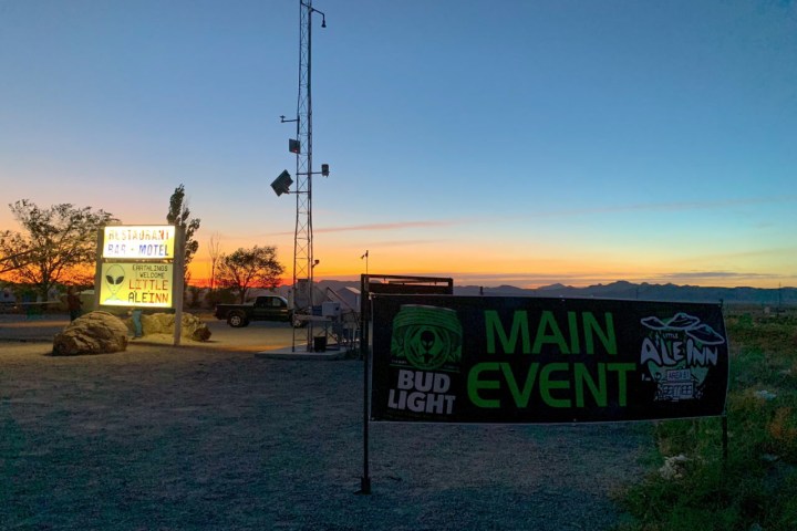 Multiple camps are visible off the highway. Some flying American flags and some with alien-themed flags, letting passersby know they’re here for the party.