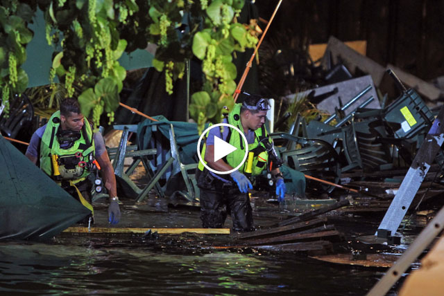 MIAMI — A packed outdoor deck behind a popular Miami-area sports bar partially collapsed during the NBA Finals on Thursday night, sending dozens of patrons into the shallow waters of Biscayne Bay.