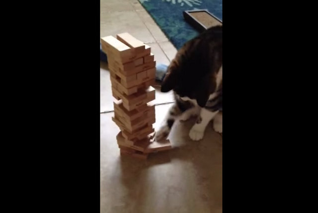 In fact, he gives his human a run for his money before having enough and unleashing his genius rage on the Jenga stack.