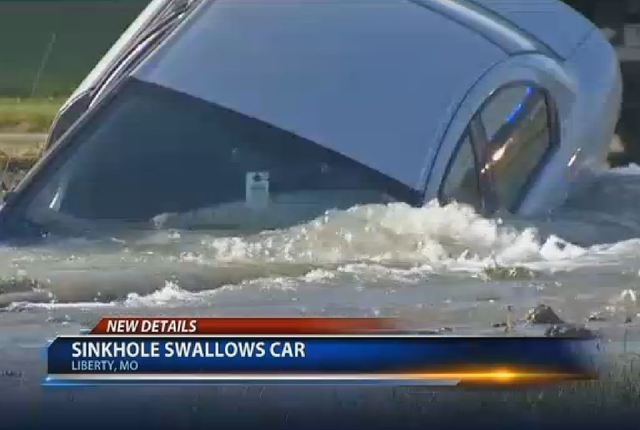 A car got stuck in a watery sinkhole created when it struck a fire hydrant in Liberty, Mo. Wednesday afternoon.