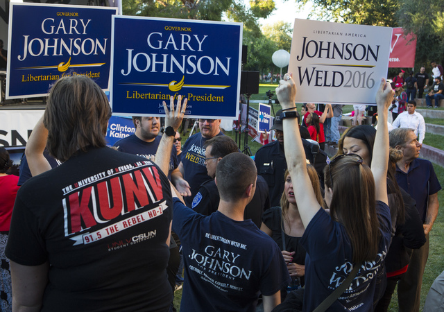With less than an hour left until the debate, a group of about 20 Gary Johnson supporters made their presence known at the MSNBC broadcast stage near UNLV’s student union. Because Johnson is the only third-party candidate on the ballot in all 50 states, the supporters repeatedly yelled, “All 50 states! All 50 states!”