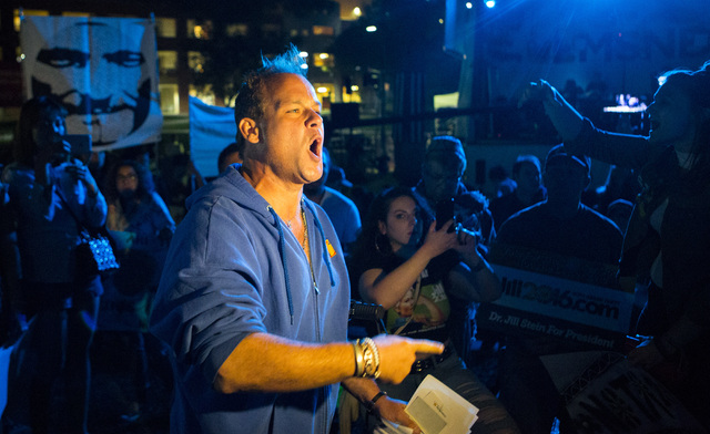 Stevens had been in the mass of protesters near the stage, on a patch of grass just north of UNLV’s Lied Library, for about four hours Wednesday. With an hour to go before the debate, he walked away from the crowd and took a break.