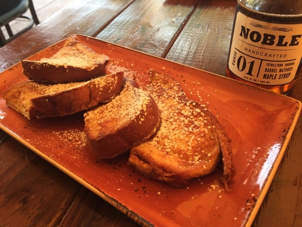 Entrees feature chilaquiles (ancho sauce, Oaxaca cheese, smoked pork, scrambled eggs, black beans and one fried egg), a doughnut sandwich (sausage, fried egg and Irish cheddar) and a vegetarian hash (roasted seasonal squash, peppers, potatoes, garlic confit, fresh herbs and eggs) and chicken fried steak (house breaded steak, chipotle sausage gravy, house potatoes and two eggs).