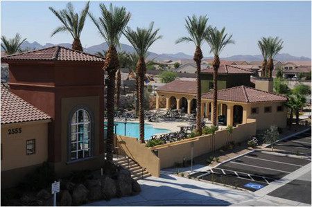 Interiors include kitchens with granite countertops and all units include enclosed garages. Each three-story building includes elevators and features an interior landscaped courtyard accessible only to residents of the building. Located near the top of Anthem's hillside development, the community offers views of the Las Vegas Strip and desert mountains.