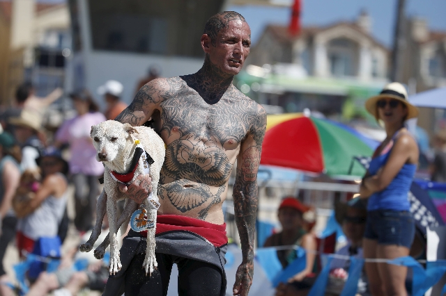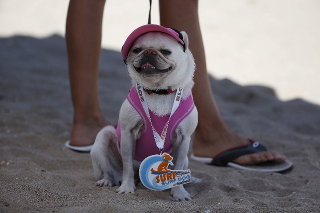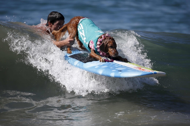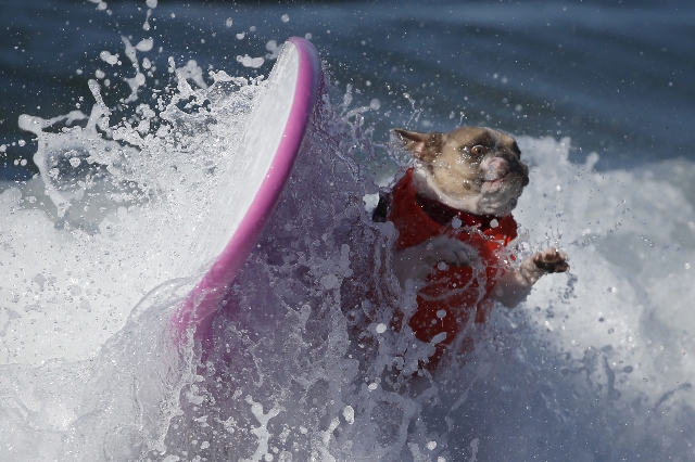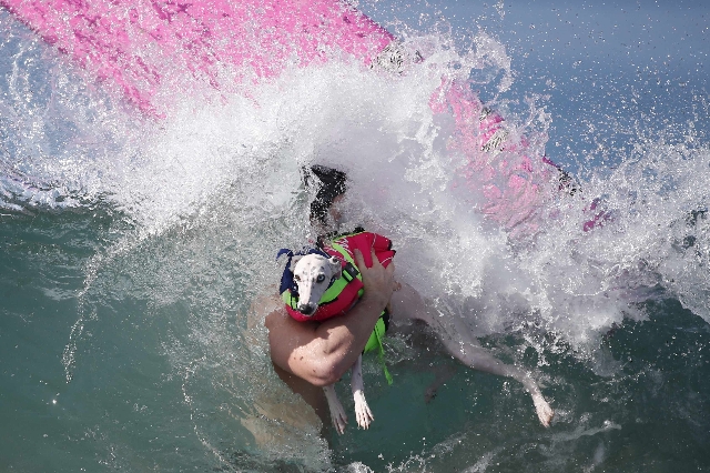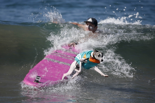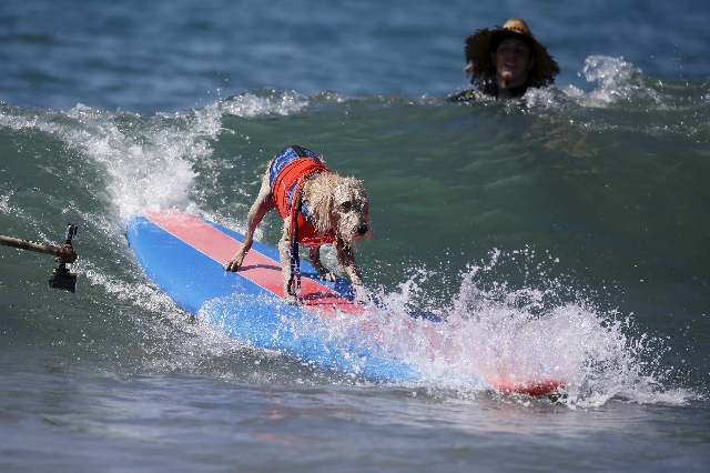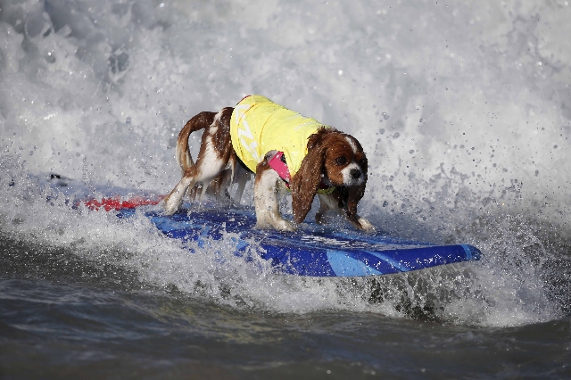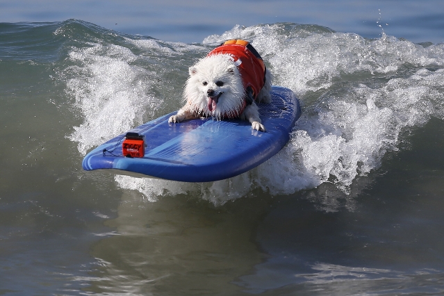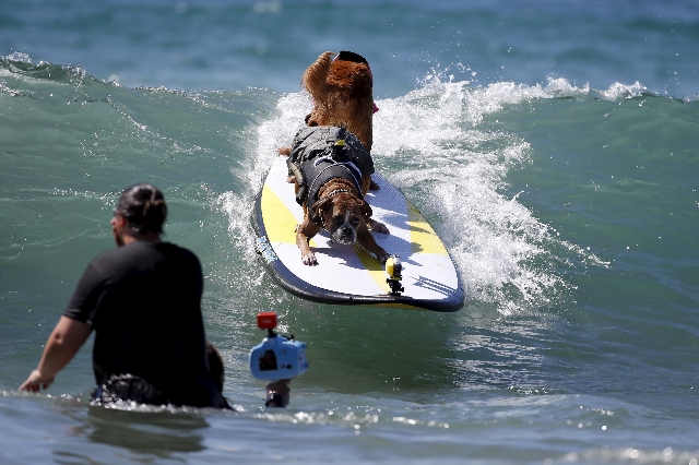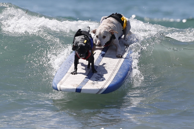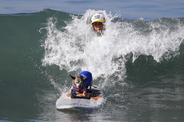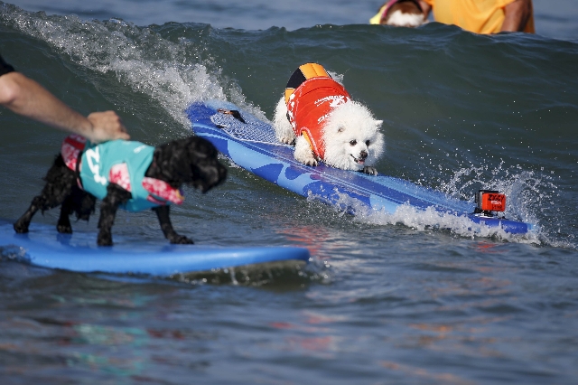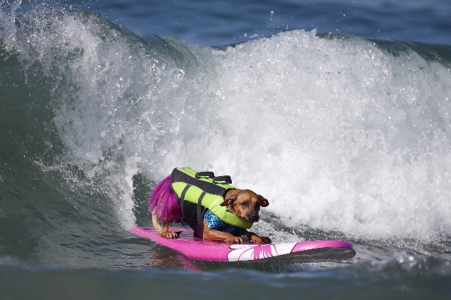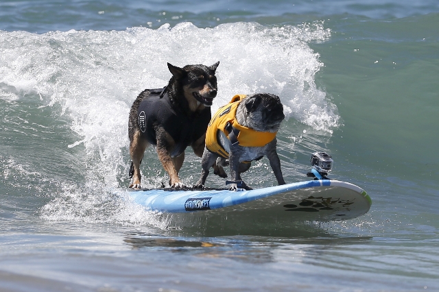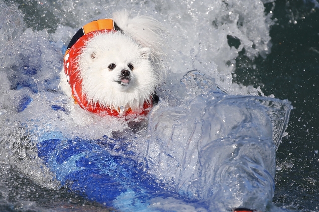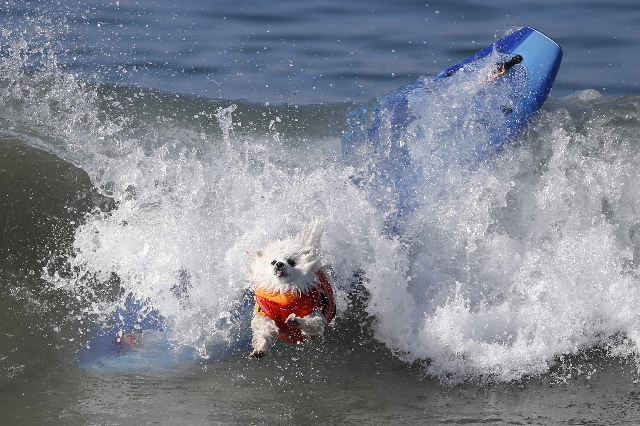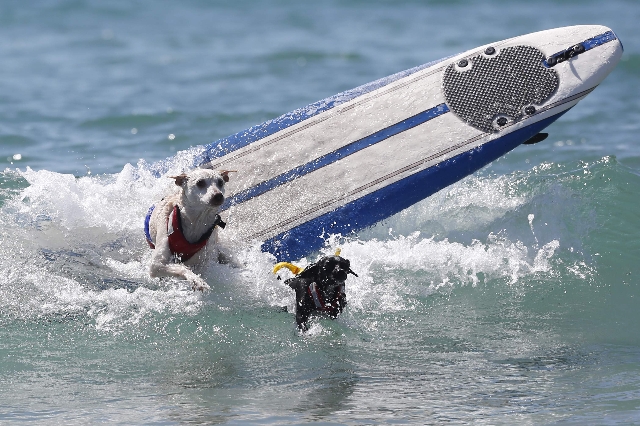 Intrepid canines showed their surfing skills at the 7th annual “Surf City Surf Dog” competition as their owners and fans cheered them on.