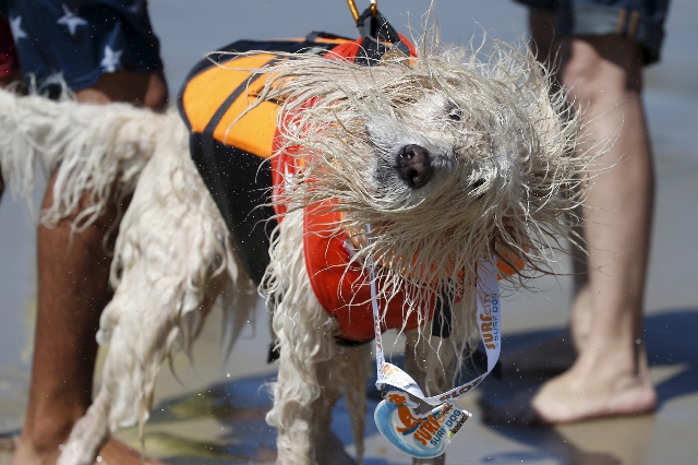 A dog shakes off after collecting its participant medal for surfing in the Surf City Surf Dog Contest in Huntington Beach, California, September 27, 2015. REUTERS/Lucy Nicholson