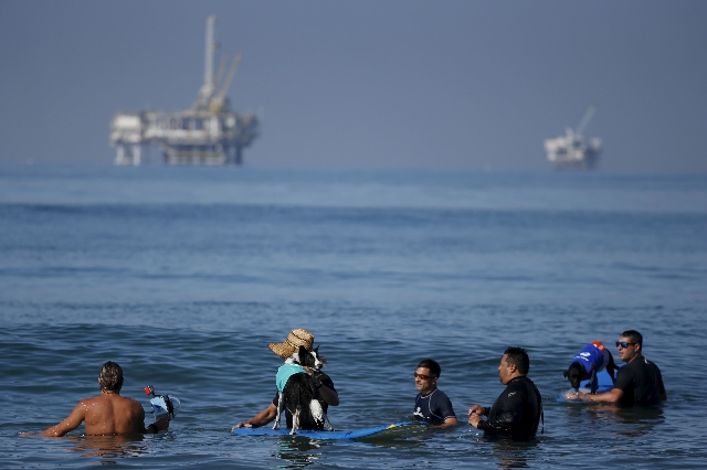 Surfing dogs wait for waves with their owners in front of oil platforms during the Surf City Surf Dog Contest in Huntington Beach, California September 27, 2015. REUTERS/Lucy Nicholson