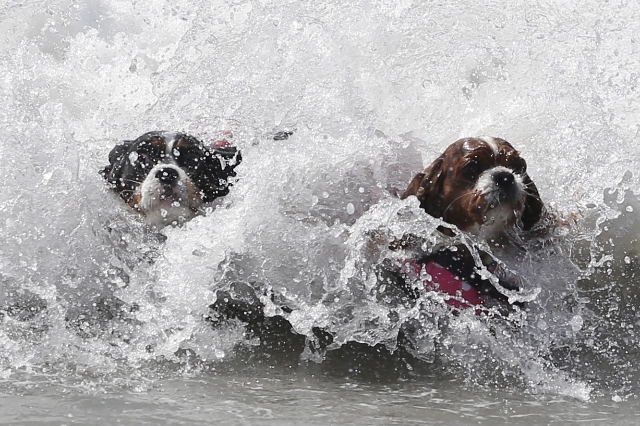 A pair of dogs wipe out during the Surf City Surf Dog Contest in Huntington Beach, California September 27, 2015. REUTERS/Lucy Nicholson